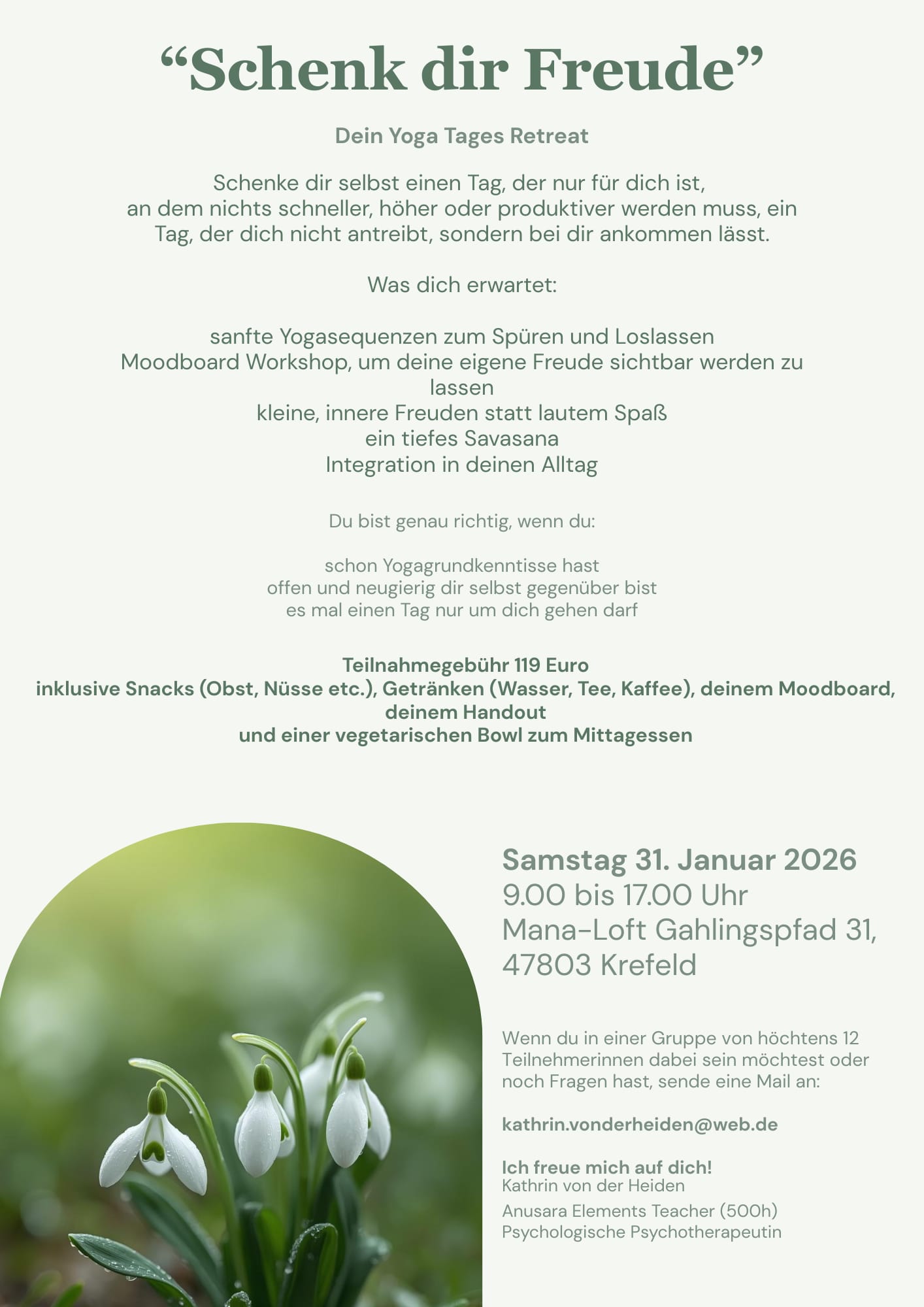 Das Yoga Tages Retreat Schenk dir Freude, veranstaltet und geleitet von Kathrin von der Heiden, lädt dich zu einer bewussten Auszeit im Mana Loft Krefeld ein.